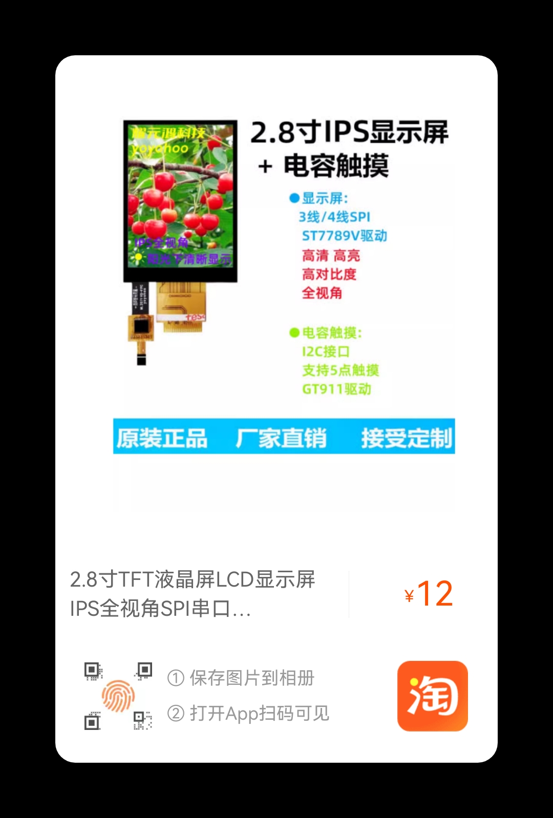【淘宝】https://m.tb.cn/h.5BjuH1B9soo3rUL?tk=rErvWK4FErO CZ3458 「2.8寸TFT液晶屏LCD显示屏IPS全视角SPI串口屏ST7789电容屏18PIN」
